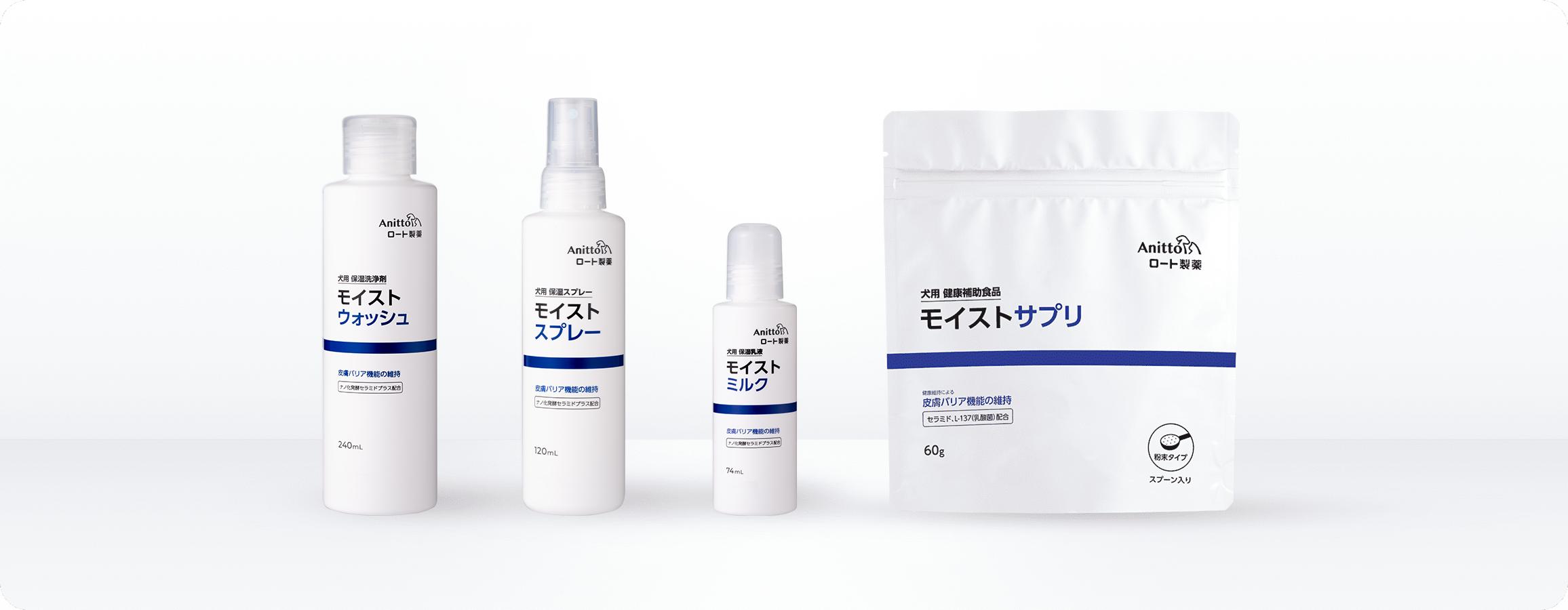 皮膚バリア機能を守るAnittoスキンケアシリーズは、目的に合わせて選択しやすい剤型で、毎日のスキンケア習慣を後押しします。愛犬とのスキンシップにも活用できます。塗布するスキンケアと食べるスキンケアのセット使いがおすすめです。