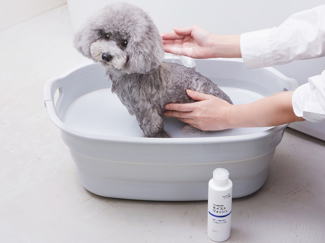 使用前にブラッシングし、ぬるま湯で皮膚、被毛をまんべんなく濡らします。