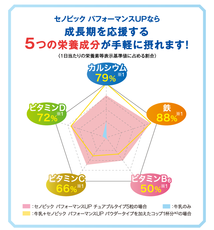 ※1:セノビックパフォーマンスUP チュアブルタイプ5粒で1日当たりの栄養素等表示基準値に占める割合を示しています。 ※2:コップ1杯とはセノビック パフォーマンスUP パウダータイプ 12g+牛乳※3150mLとして換算。 ※3:日本食品標準成分表2020