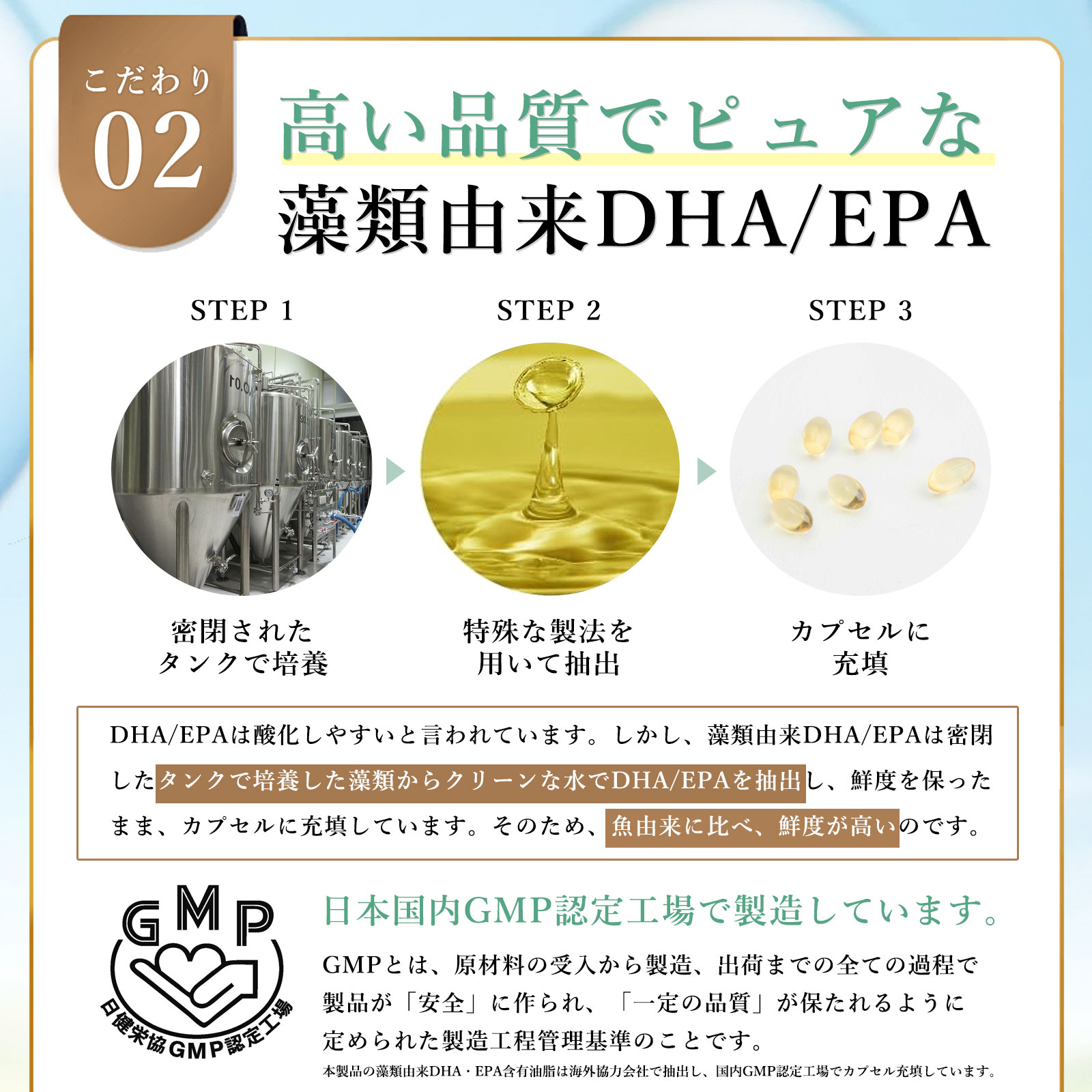 本製品の原料は藻類から抽出した100%植物性DHA・EPAを使用しており、魚アレルギーをお持ちの方はもちろん、ベジタリアンやビーガンの方にも安心してお召し上がりいただけます。体に必要なオメガ3を、地球環境にもやさしい藻類由来の形で手軽に補える、新しい時代のサプリメントです。