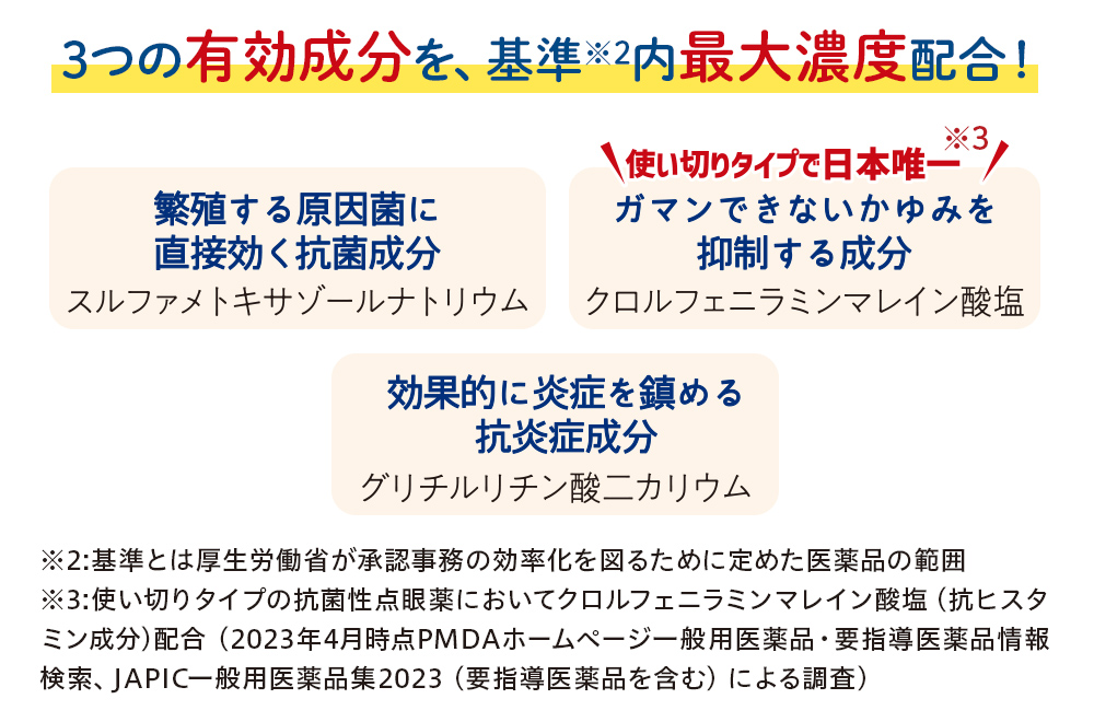 はい。“ものもらい”や結膜炎の繁殖する原因菌に抗菌力を発揮する抗菌成分(スルファメトキサゾールナトリウム)と、1回使い切りタイプの抗菌目薬としては日本で唯一※3かゆみ抑制成分(クロルフェニラミンマレイン酸塩)を配合した処方となっています。また、炎症を鎮める抗炎症成分(グリチルリチン酸二カリウム、イプシロン-アミノカプロン酸)もダブルで配合しました。そしてこれらの抗菌成分・かゆみ抑制成分・抗炎症成分(グリチルリチン酸二カリウム)は、基準※4内最大濃度配合しているんです。
