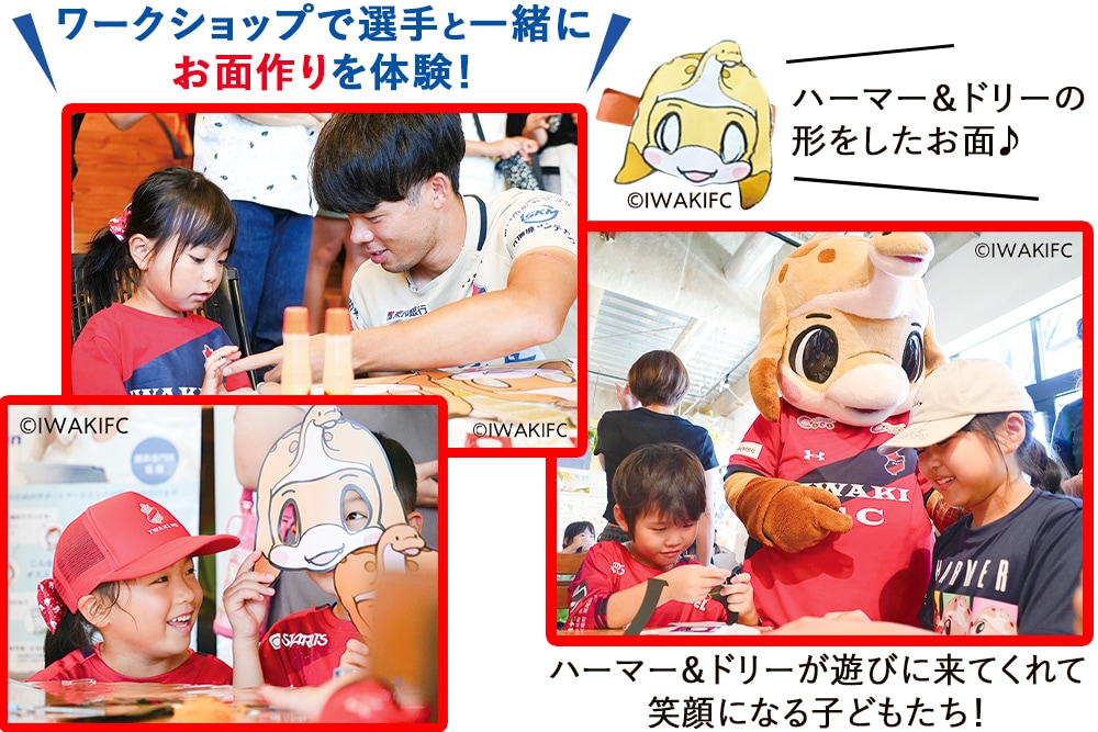 目の病気について話をした後は、緑内障や弱視などで視覚機能が低下した際、どのような見え方になるのかを体験できるワークショップを開催。いわきFCのマスコットキャラクター、ハーマー&ドリーの目の部分に、色がついたセロファンと黒色の丸い紙を貼ることで、見えにくさや視野の欠けを体験できるお面を作っていただきました。子どもたちが真剣な様子で、ときおり選手に手伝ってもらいながら夢中になって工作をしていると、ハーマー&ドリーが登場し、会場が一気に盛り上がり楽しい雰囲気に!