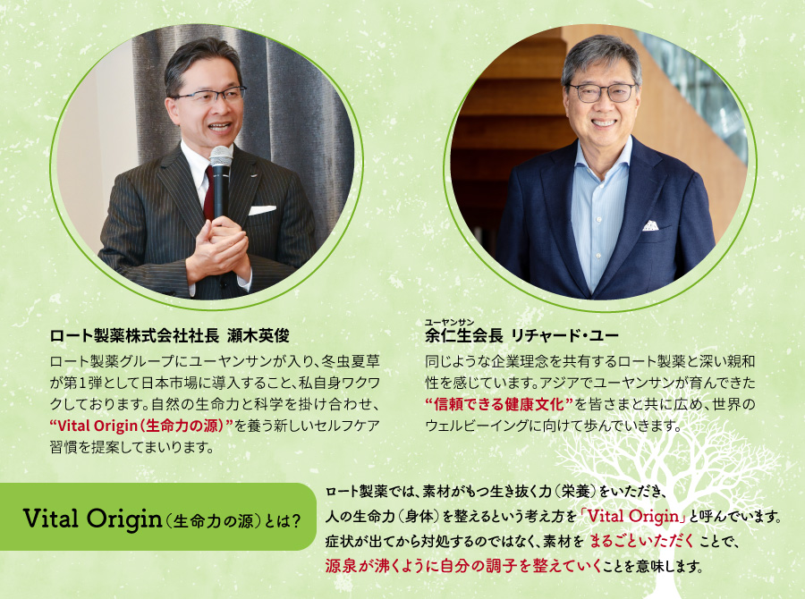 ロート製薬グループにユーヤンサンが入り、冬虫夏草が第1弾として日本市場に導入すること、私自身ワクワクしております。自然の生命力と科学を掛け合わせ、“Vital Origin(生命力の源)”を養う新しいセルフケア習慣を提案してまいります。