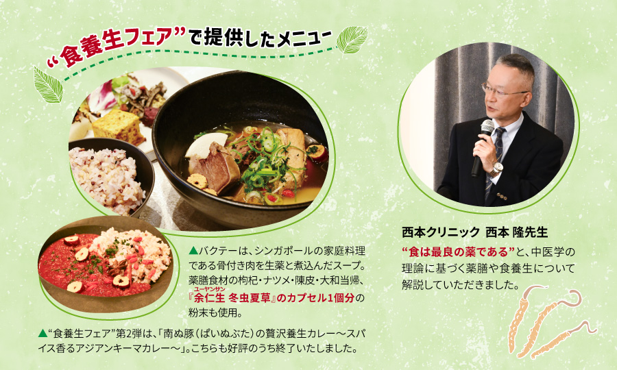 『余仁生 冬虫夏草』の発売を記念し、Vital Originを体感いただくため、「ロートレシピ 梅田NU茶屋町プラス店」で“食養生フェア”を実施(現在は終了)。発表会では、ご来場の皆さまに“食養生フェア”第1弾で提供した、冬虫夏草を用いたロート製薬監修の特別メニュー「二種肉の贅沢薬膳肉骨茶(バクテー)~大和当帰仕立てアジアン粥~」をご試食いただきました。