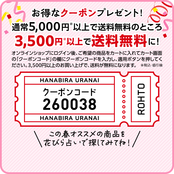 オンラインショップにログイン後、ご希望の商品をカートに入れてカート画面の「クーポンコード」の欄にクーポンコードを入力し、適用ボタンを押してください。3,500円以上のお買い上げで、送料が無料になります。※税込・値引後